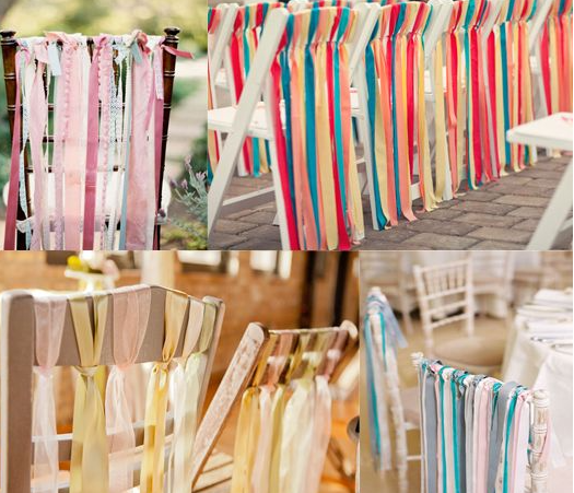 Weaving fabrics through the components of a folding chair is another great way to dress up a drab chair into something that will look elegant and lovely in wedding photos. Some great options are tulle, taffeta, and printed cotton.