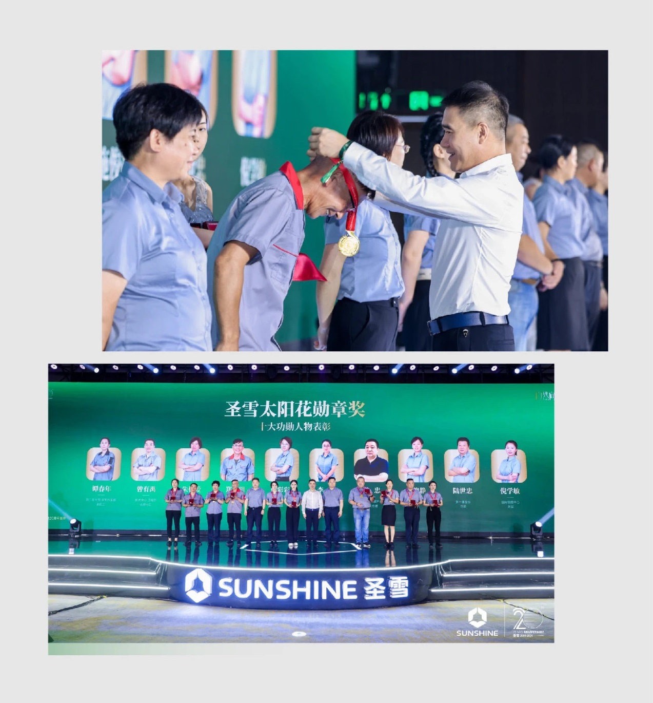 In the development of Shengxue, every employee is the most valuable asset of the company. It is their hard work and unremitting efforts that have forged the brilliant achievements of Shengxue. At the special event of the 20th anniversary celebration, the Sunflower Medal Commendation Ceremony, Sunshine paid the highest respect and thanks to the loyal employees of the long-term service company. The recipients of these sunflower medals not only witnessed the growth of Sunshine, but also became an indispensable force for the development of the company. Sunshine promises to continue to provide employees with a better working environment and growth opportunities, and share the joy of success.