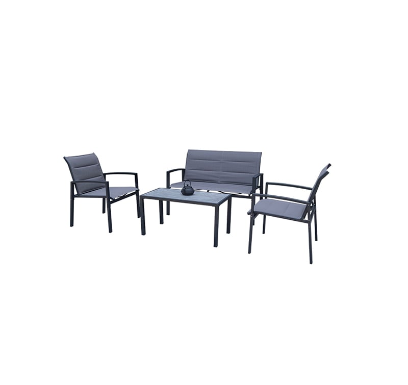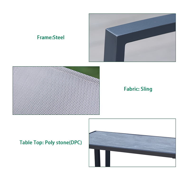 Powder-coated steel frame provides strong support and rust resistance for outdoor use. Breathable sling seating dries quickly and stays comfortable in warm temperatures. Poly stone tabletop mimics natural stone while remaining lightweight and easy care. Complete seating group creates a comfortable lounge zone for family and guests.