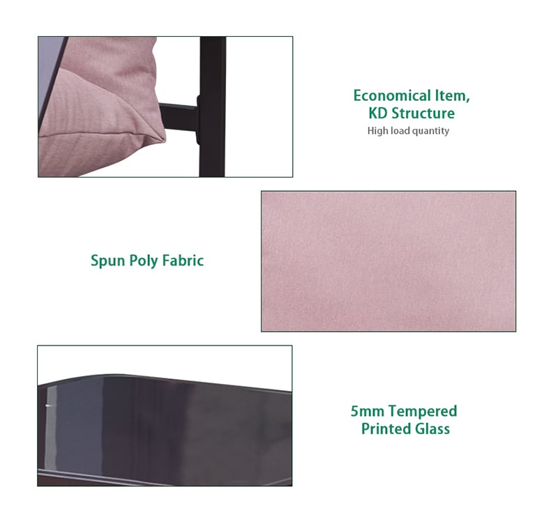 Powder-coated steel frame provides strong support and rust resistance for outdoor use. Spun poly fabric is soft yet durable, designed specifically for outdoor performance. Tempered glass tabletop is smooth, safe, and easy to wipe clean after outdoor use. Complete seating group creates a comfortable lounge zone for family and guests.