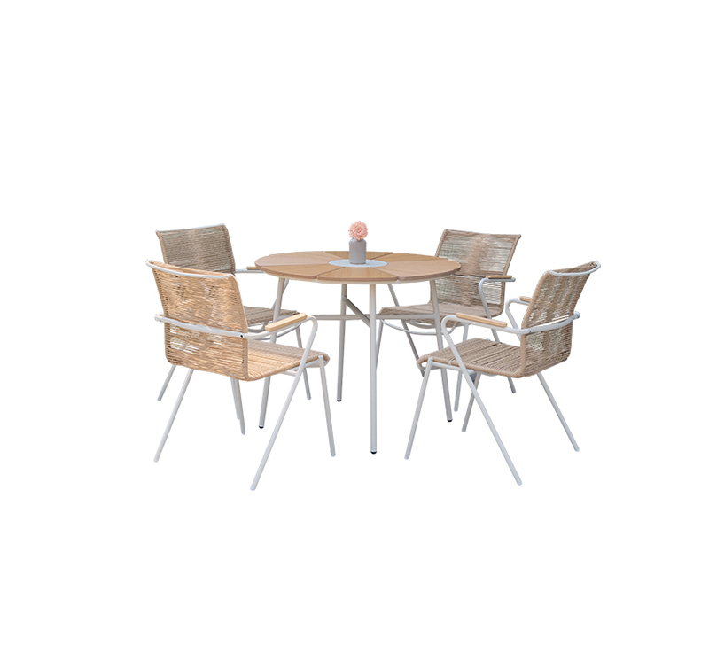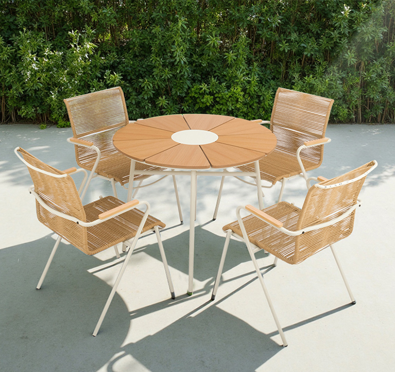 Powder-coated steel frame provides strong support and rust resistance for outdoor use. PE rattan elements add woven texture with weather-resistant, low-maintenance performance. Polywood table top provides the look of wood without the need for sanding or sealing. Space-saving dining layout is ideal for alfresco meals on patios, balconies, or gardens.