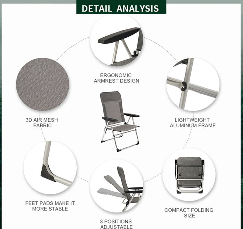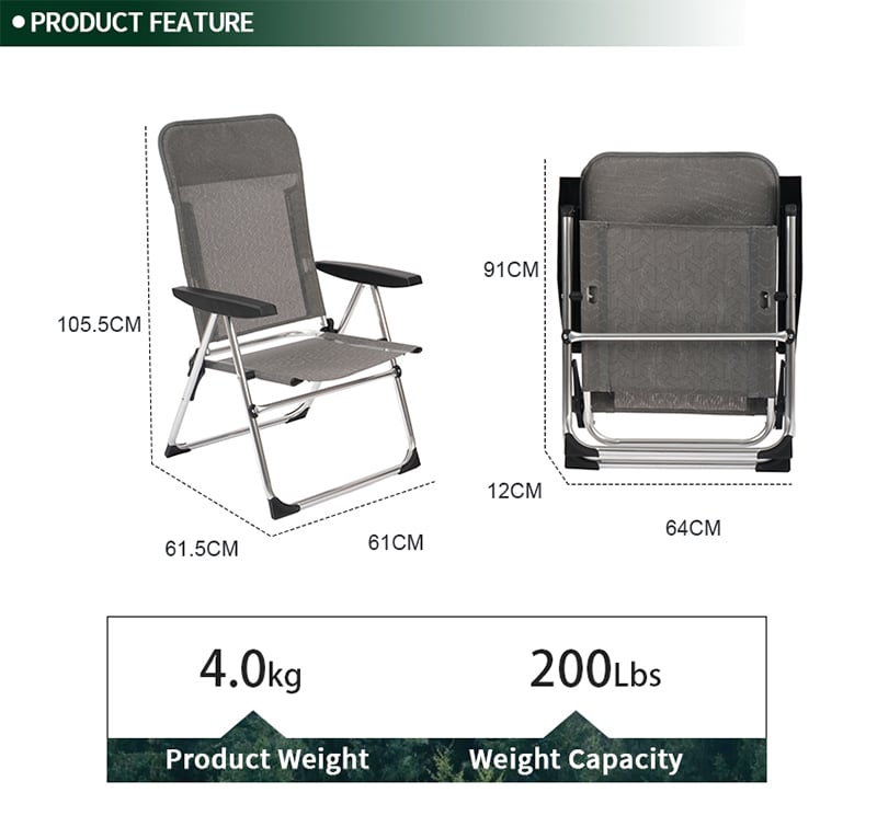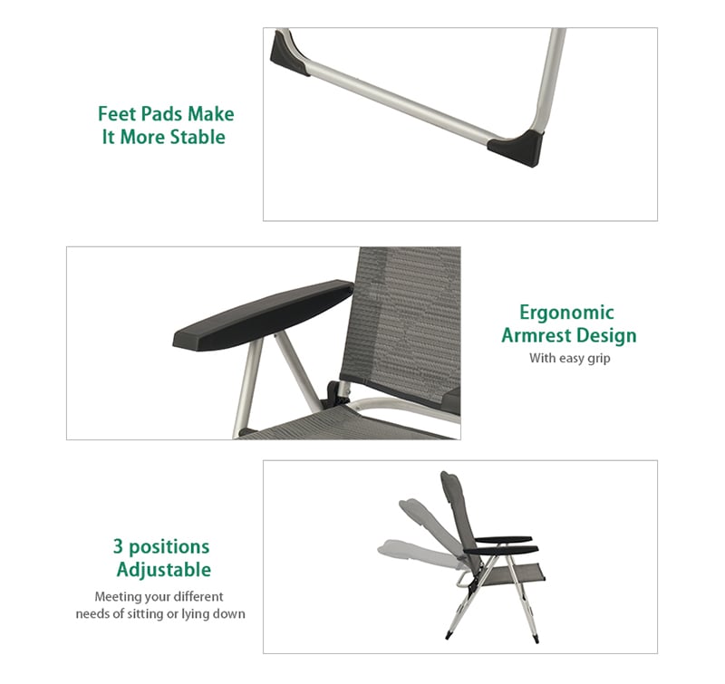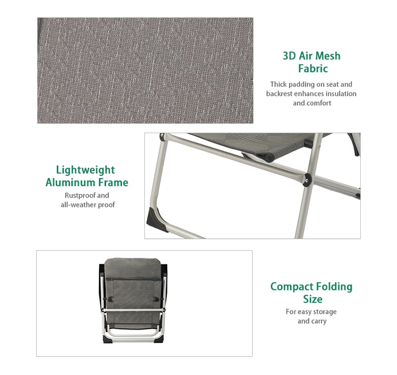 A highly comfortable folding chair with five reclining positions, ergonomic design and head support. Plush fur fabric(front)+600D polyester fabric(back). Soft and breath. The chair has an adjustable, removable head rest. Lightweight aluminum frame rustproof and all-weather proof. Folded to compact size Compact folding size for easy storage and carry.