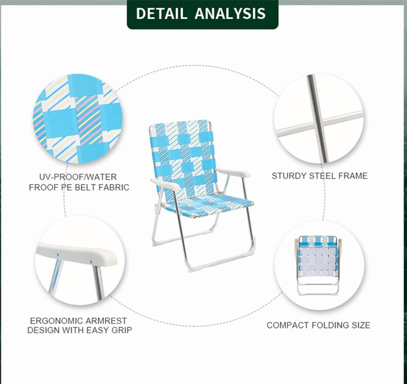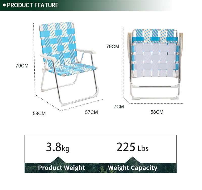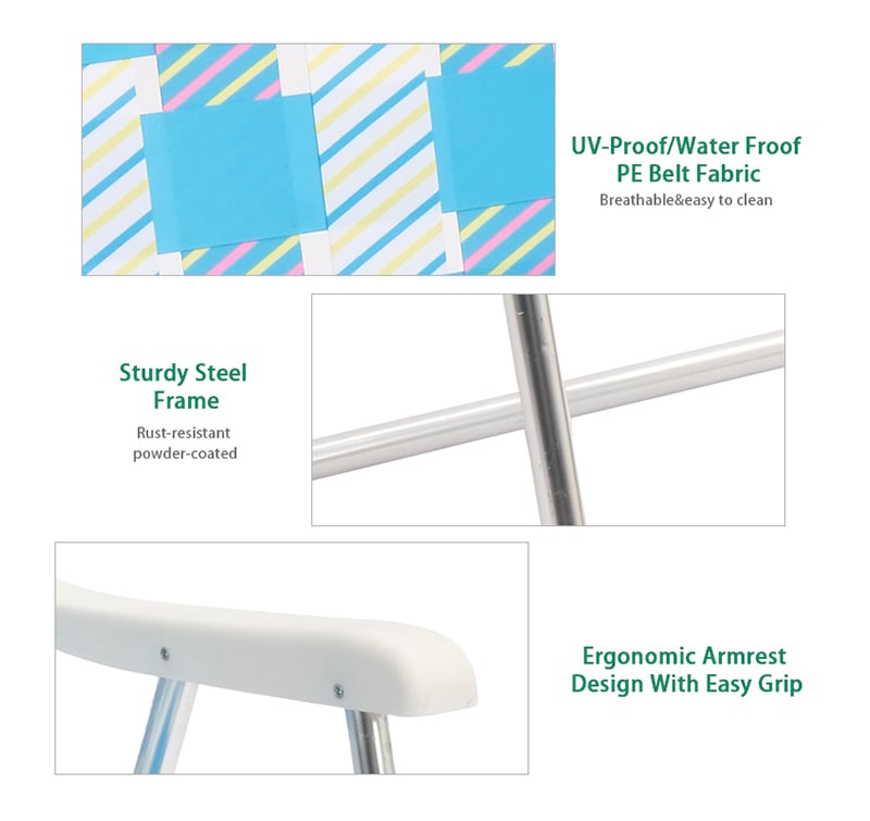 Colorful and durable weather-resistant PE web strap. It features resin stay-cool armrests. Breathable webbing seat and back for comfortable sitting experience. Made of a heavy duty steel frame which makes this chair a strong, durable. It folds flat for easy storage.