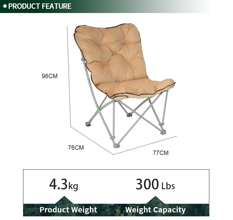 Padded design and provides more comfort. Made of sturdy powder-coated steel frame and high quality 600D polyester fabric. Can hold up to 120 kg, the chair is made to withstand a lifetime of enjoyment. No assembly needed, easy to open and fold. It can be folded in a very compact size for easy transportation and storage.
