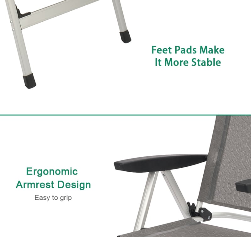 A comfortable folding chair with seven positions. Made of sturdy anodized aluminum frame and high quality 600G Textilene fabric. Graceful design expecially the armrest; patented for design and structure. No assembly needed, easy to open and fold. Lightweight and easy to carry, packs down to a small size.