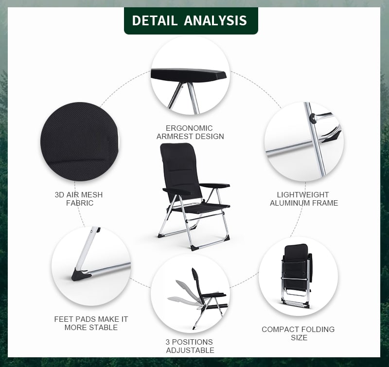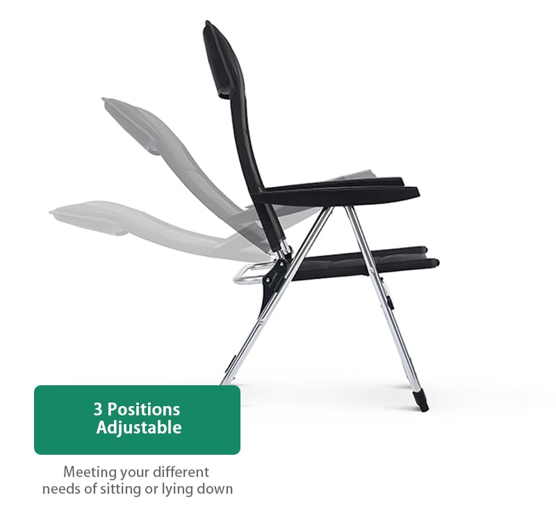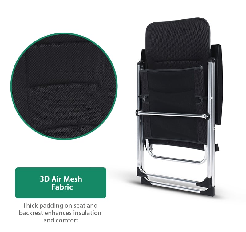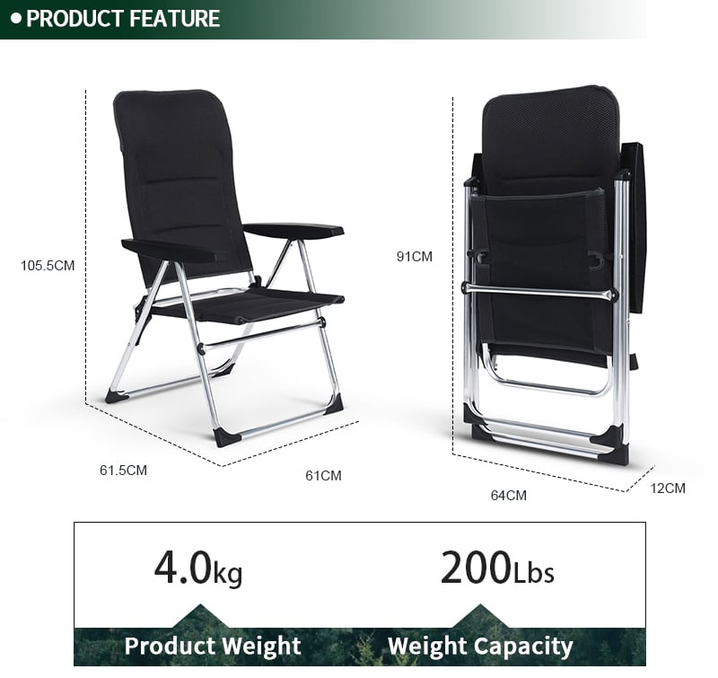 Settle in anywhere with the High Quality 5 Position Adjustable Portable Aluminum Lightweight Outdoor Folding Camping Chair With Armrest. Lightweight aluminum frame, breathable mesh panels, supports up to 300 lbs for lasting comfort. Thoughtful touches include adjustable armrests, quick-fold design, and breathable mesh. Packs into the included carry bag for grab-and-go convenience. Net weight 4.0 kg. Ideal for camping, events, patios and parks.
