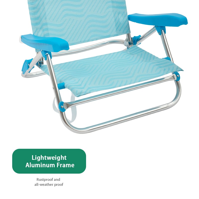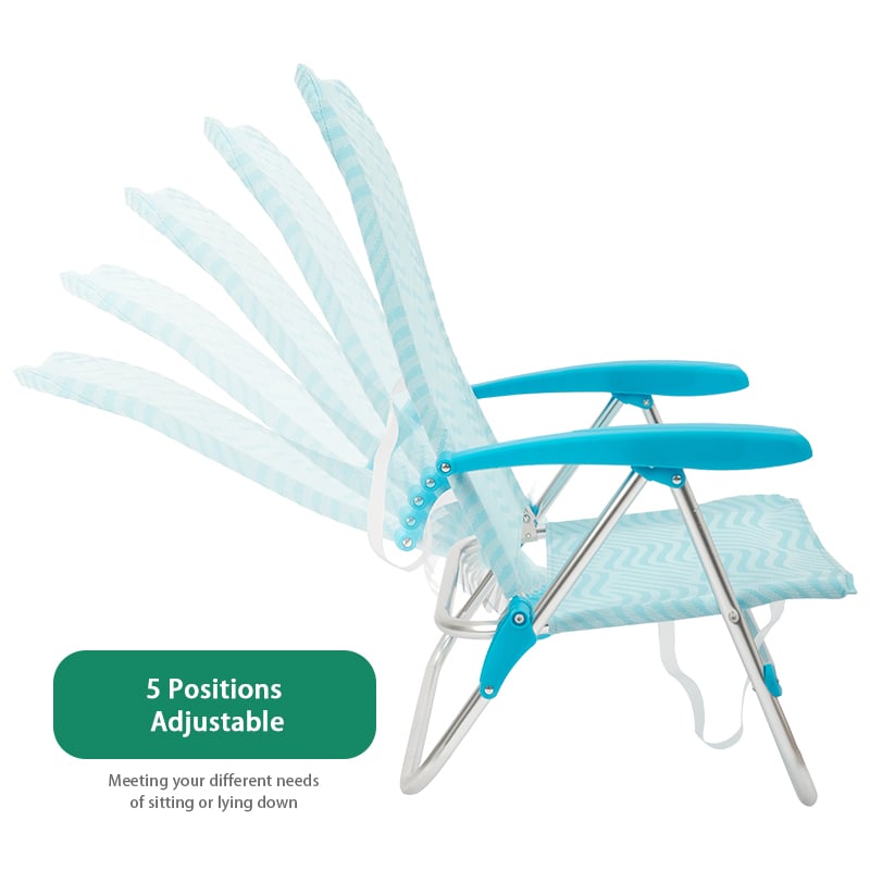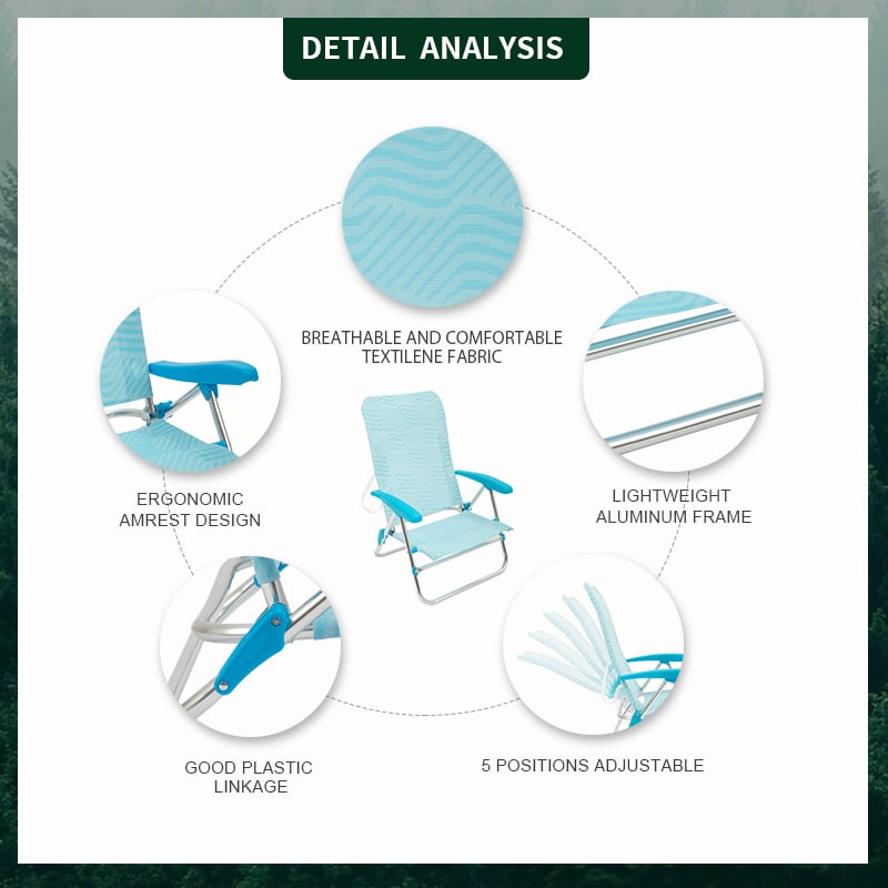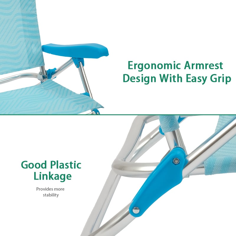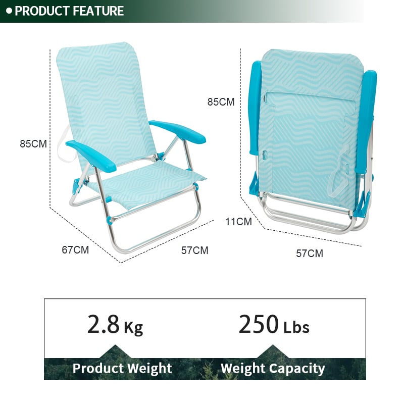 Settle in anywhere with the Outdoor Aluminum Beach Lounge Chair Recliner low seat foldable backpack beach chairs. Lightweight aluminum frame, powder-coated steel frame, supports up to 350 lbs for lasting comfort. Thoughtful touches include adjustable armrests, quick-fold design, and compact fold. Packs into the included carry bag for grab-and-go convenience. Net weight 3.2 kg. Ideal for camping, events, patios and parks.