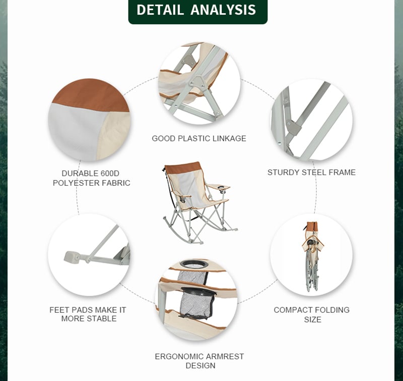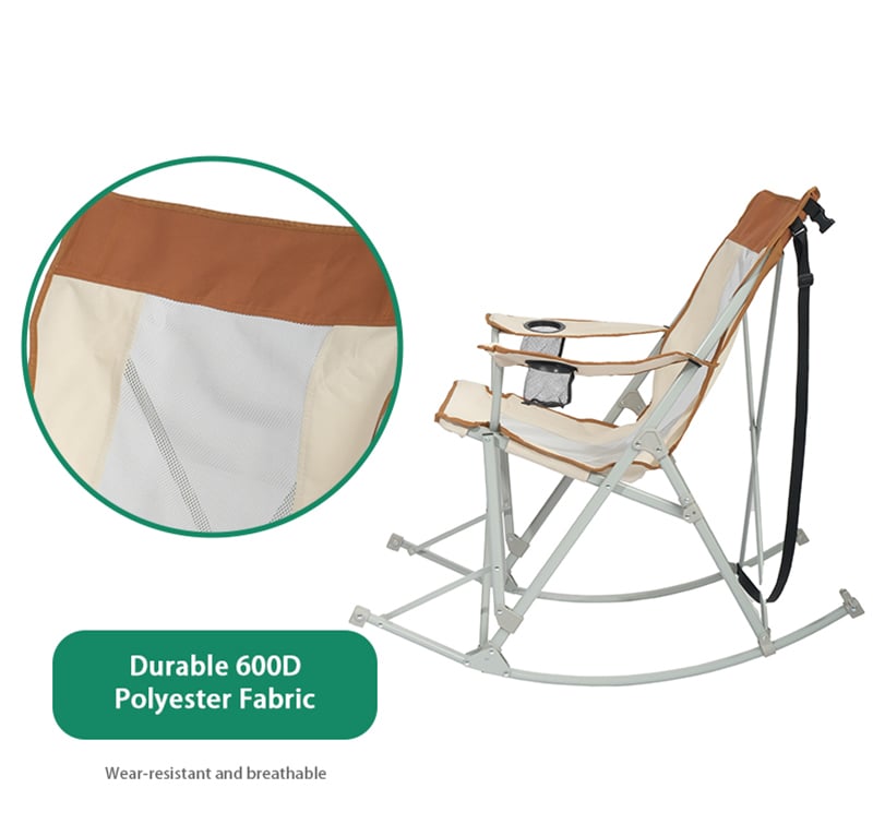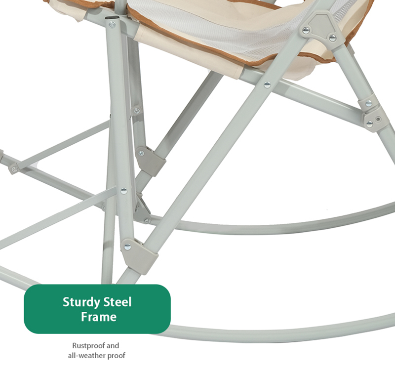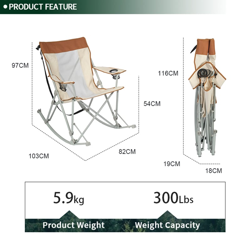 Different from the other folding chair, this chair has a novel design, it can rock. Rocking design and with armrests provides more comfort. Made of sturdy powder-coated steel frame and high quality 600D polyester fabric. Can hold up to 300 LBS, the chair is made to withstand a lifetime of enjoyment. No assembly needed, easy to open and fold. It can be folded in a very compact size for easy transportation and storage.